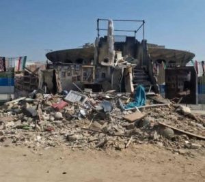 تصویر: شهرداری تهران، ماکت یک خرابه، ساخته شده از نخالههای ساختمانی را بهعنوان یادمان تخریبهای جنگ، در برابر تئاتر شهر نصب کرد