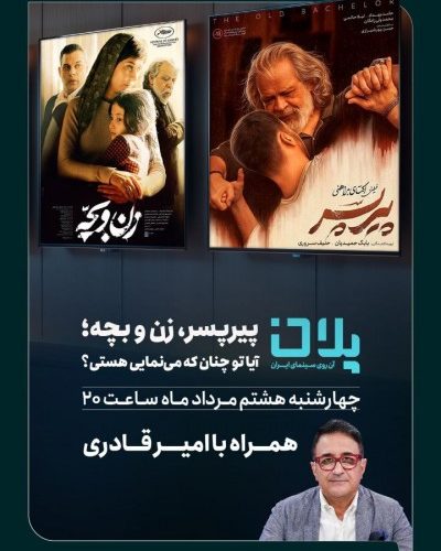 ساعت هشت امشب، چهارشنبه هشتم مرداد، امیر قادری، برای نخستینبار و بهصورت زنده دربارهی “پیر پسر” و “زن و بچه”، گفتوگو خواهد کرد. فیلمهای اکتای براهنی و سعید روستایی، که این روزها بر پردهی سالنهای سینمای تهران هستند.